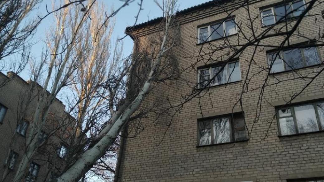 По словам дончан ЧП с упавшим деревом произошло и в центре города, где на улице Розы Люксембург 99 дерево упало прямо на пятиэтажное здание:
