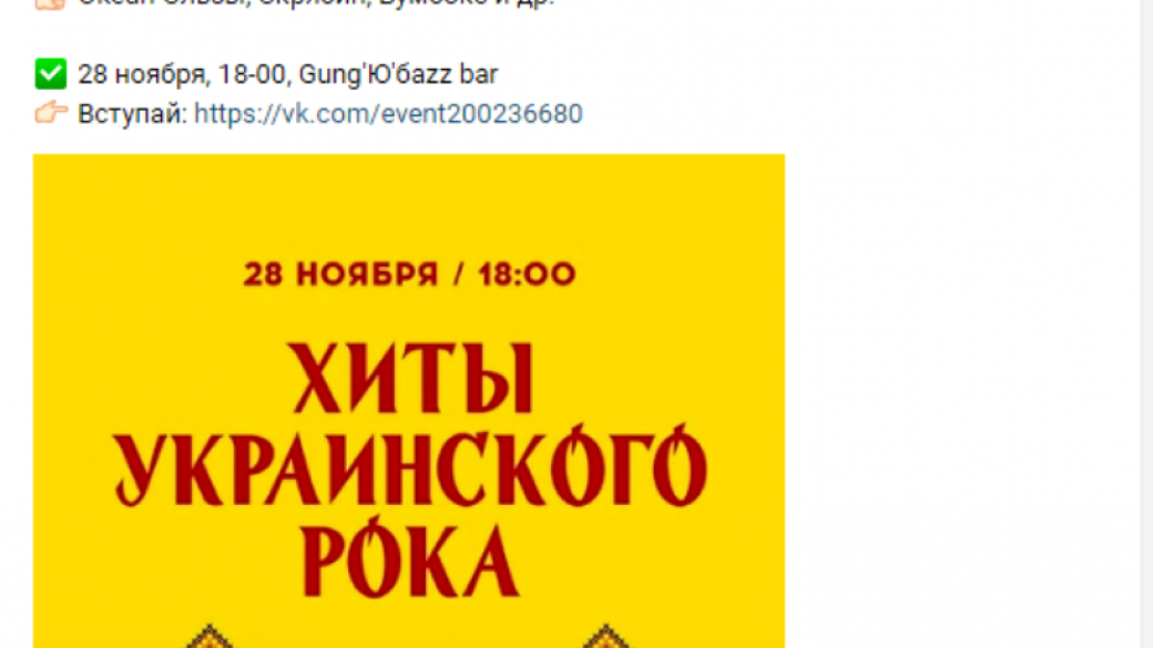 28 ноября в центре неподконтрольного Украине Донецка в баре Gung’Ю’бazz Bar прозвучат «Хиты украинского рока». Соответствующий анонс опубликован в одном из сообществ в соцсети. Данное мероприятие вызвало гнев у членов НВФ. Так, подконтрольный НВФ Телеграмм-канал «Донецкий Абориген» возмущен бездействием «силовых структур», позволяющих подобные концерты.