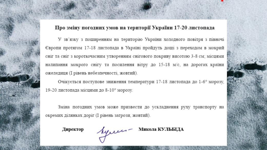 По информации синоптиков, из-за распространения с севера Европы холодного воздуха 17-18 ноября в Украине пройдут дожди с переходом в мокрый снег и снег. Также возможно кратковременное образование снежного покрова высотой 3-8 см. Кроме того, ожидается налипание мокрого снега и усиление ветра до 15-18 м/с.