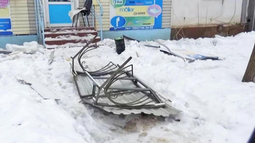 Утром, 15 января, почти одновременно пострадали наружные конструкции нескольких магазинов. Кроме того были повреждены козырьки над подъездами и балконами жилых домов.