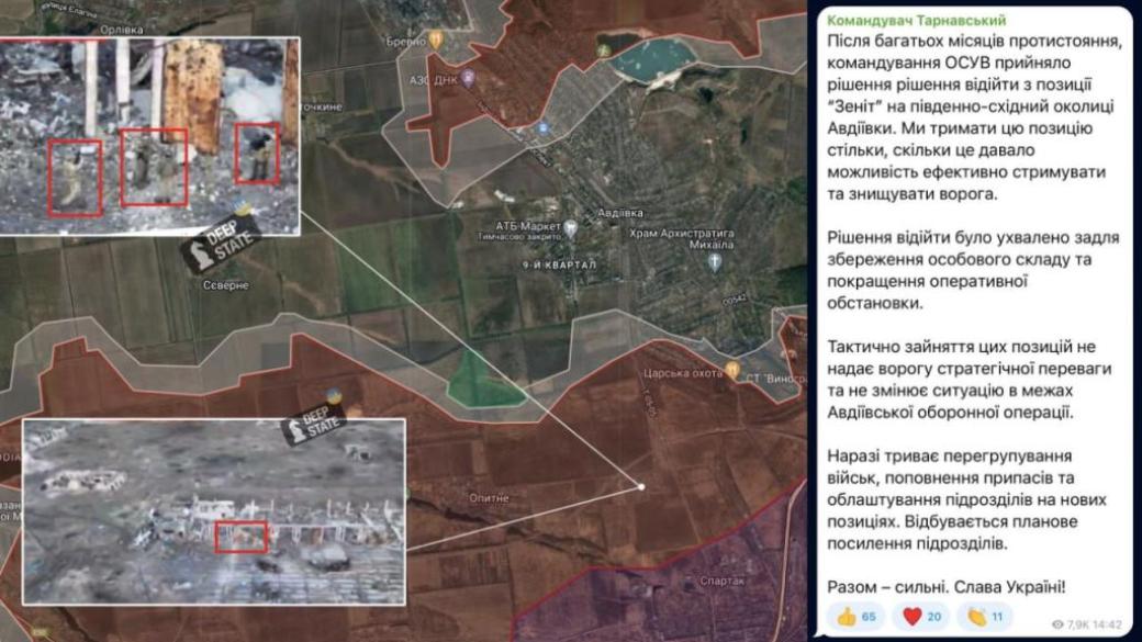 "Мы держали эту позицию столько, сколько давало возможность эффективно сдерживать и уничтожать врага. Решение отойти было принято с целью сохранения личного состава и улучшения оперативной обстановки. Тактическое занятие этих позиций не дает врагу стратегического преимущества и не изменяет ситуацию в рамках Авдеевской оборонной операции. В настоящее время продолжается перегруппировка войск, пополнение запасов и обустройство подразделений на новых позициях. Происходит плановое усиление подразделений".