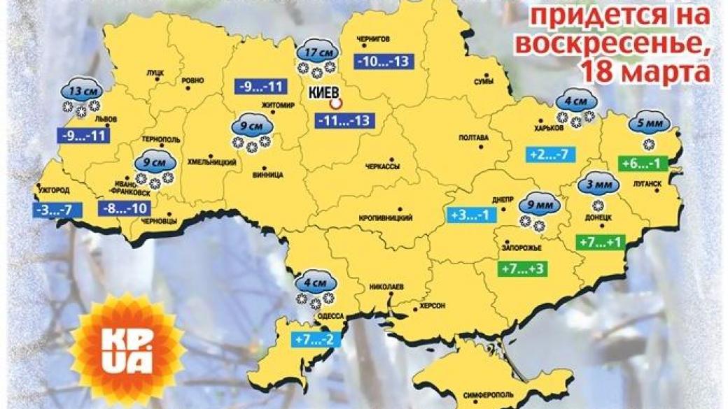 По прогнозам, 17−19 марта выпадет много снега на севере Украины. В Черниговской, Сумской и, возможно, в Киевской областях добавится 20−30 сантиметров снежного покрова. В этих районах ожидается самое интенсивное снижение температуры — до 10−15 градусов мороза.