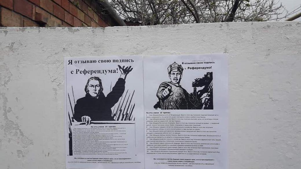 В оккупированной Ялте накануне очередной даты так называемого «референдума» в аннексированном Крыму появились листовки «Я отзываю свою подпись с референдума». Об этом на своей странице в соцсети сообщил офицер ВСУ Анатолий Штефан (Штирлиц).