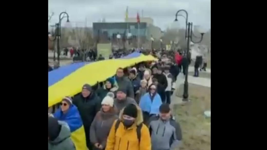 Теперь у протестующих появилось жовто-блакитне полотнище, люди под лозунги «Бердянськ — це Україна» пронесли его по улицам города