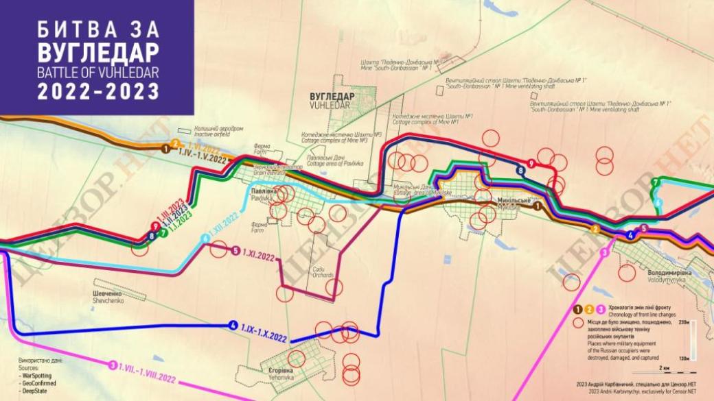 Военкор Юрий Бутусов подготовил и опубликовал детальную карту боев в районе Угледара в Донецкой области, на которой показаны изменения линии фронта с апреля 2022 г. (после того, как войска РФ захватили Волноваху и продолжали осаду Мариуполя) по сегодняшний день.