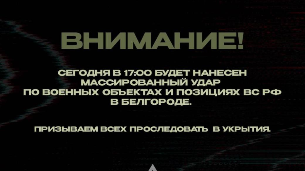 "Внимание! Уважаемые жители Белгорода и области! Сегодня в 17:00 будет нанесен массированный удар по военным объектам и позициям ВС РФ в Белгороде. Призываем всех, кто еще не успел покинуть регион, немедленно уйти в укрытие!. Берегите себя и ваших близких".