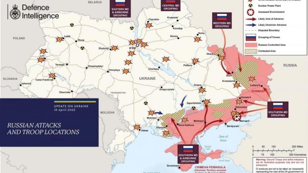 В британской разведке опубликовали карту боевых действий на территории Украины по состоянию на 16 апреля.