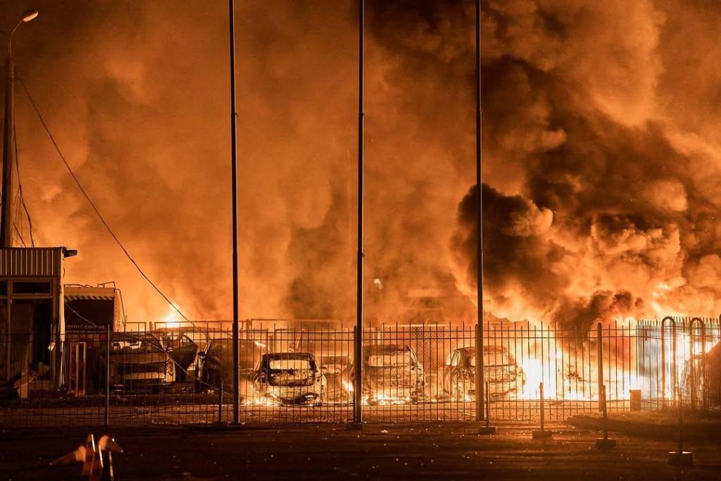В Оболонском районе загорелись припаркованные автомобили, повреждено рядом расположенное складское здание, шиномонтаж и здание магазина. Погибли 2 человека, также пострадали 6 человек, из которых 4 работника скорой помощи и 2 работника полиции, которые прибыли на место.