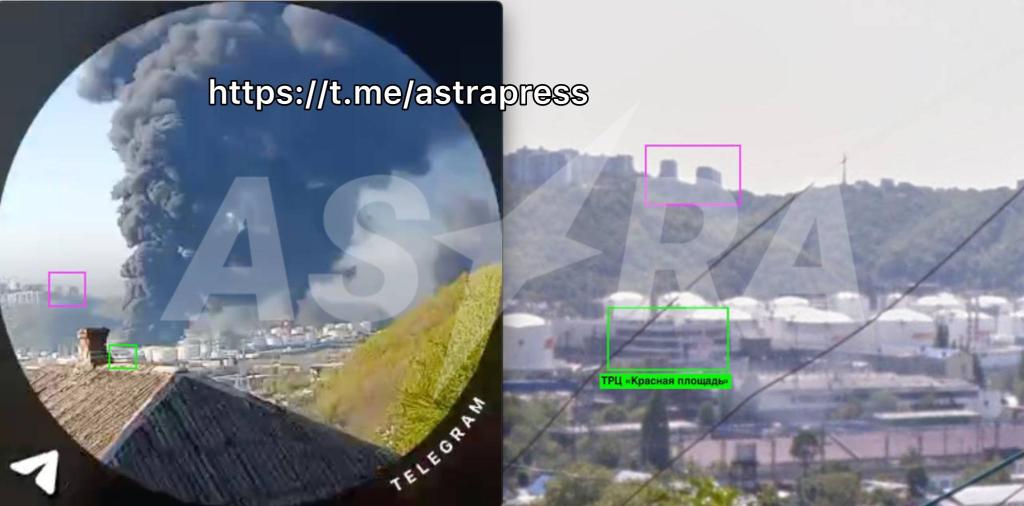 OSINT-аналитик ASTRA по видео, снятому очевидцем, установил как минимум три очага пожара в Туапсе — два из них находится на территории Туапсинского нефтеперерабатывающего завода (НПЗ) и один — в море у берега. На НПЗ горят резервуары с топливом, определить, что конкретно горит в море по этому видео не представляется возможным, отметил OSINT-аналитик ASTRA.