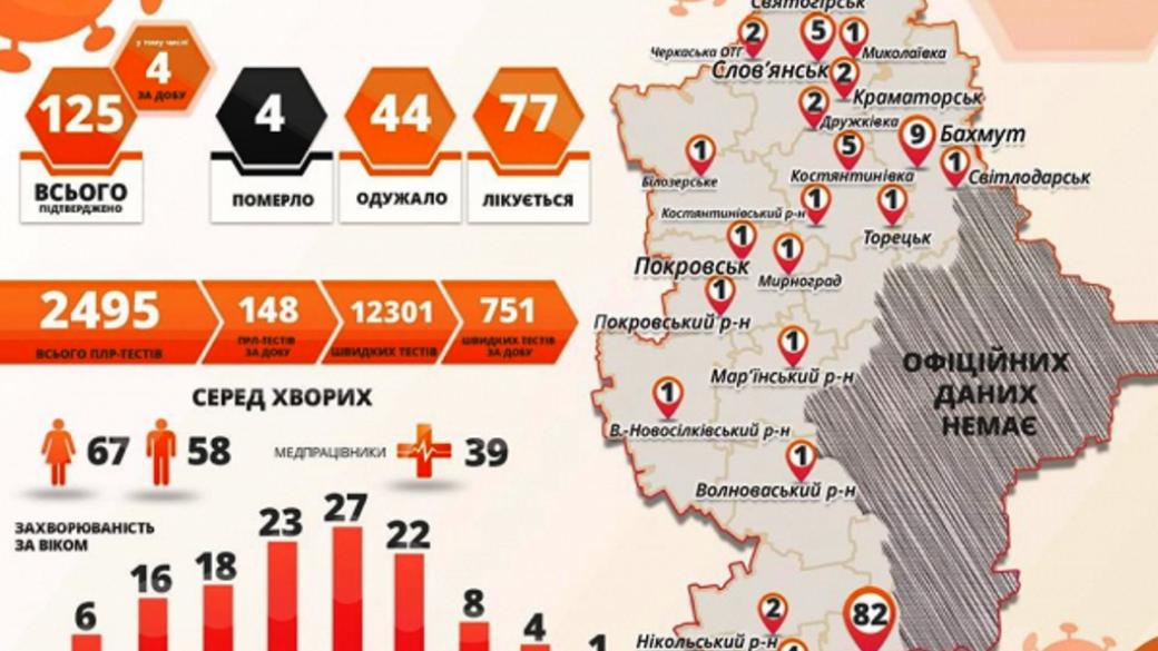 Всего в Донецкой области с начала объявления карантина инфицировано 125 человек.