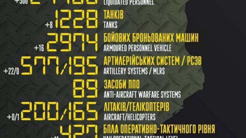 Россия за сутки потеряла в Украине почти 500 военных, самолет, вертолет и десятки танков