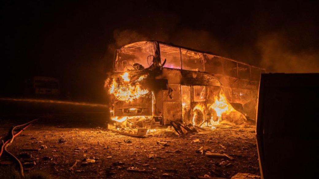 Как можно увидеть по снимкам, сгорели двухэтажные автобусы.