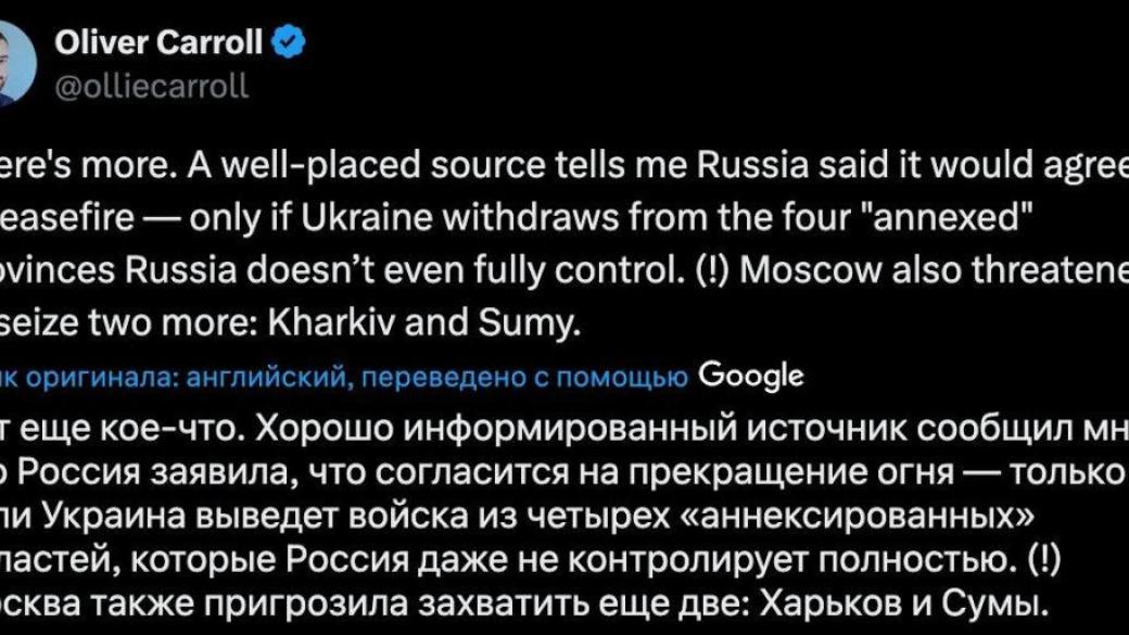 "Россияне так обнаглели, что грозились захватить Харьковскую и Сумскую области, а также заявили, что согласятся на прекращение огня только в случае вывода украинских войск из четырёх областей".