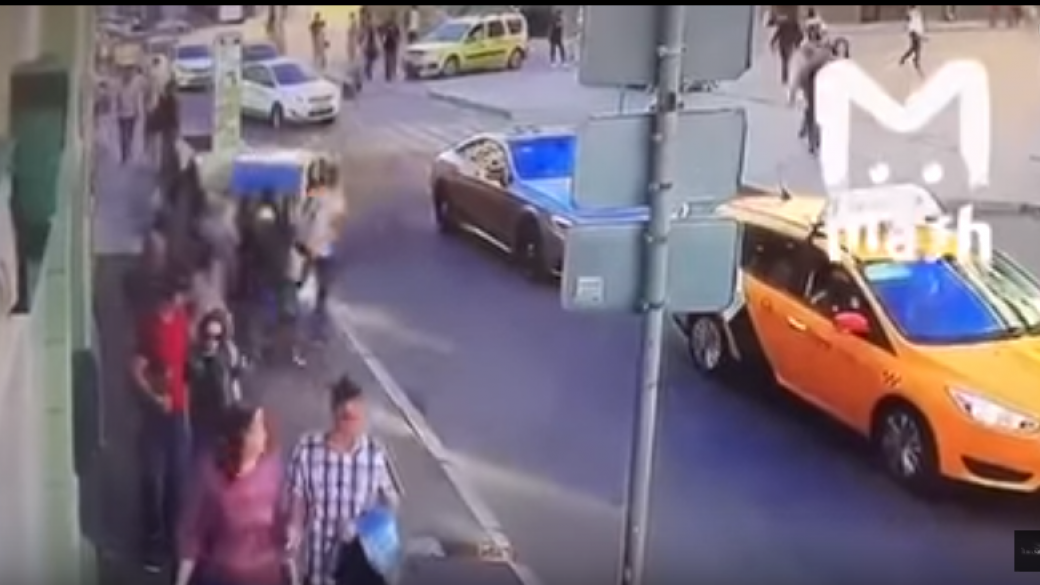В Москве камеры наблюдения зафиксировали момент наезда такси на пешеходов и его попытку побега с места ДТП.