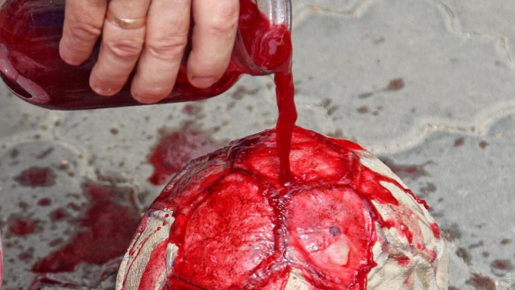 По его словам, цель данной акции показать всему миру, что Россия является страной-террористом. Участники акции облили футбольные мячи красной жидкостью и забили голы в «ворота РФ», перебросив спортивные снаряды через забор дипмиссии.