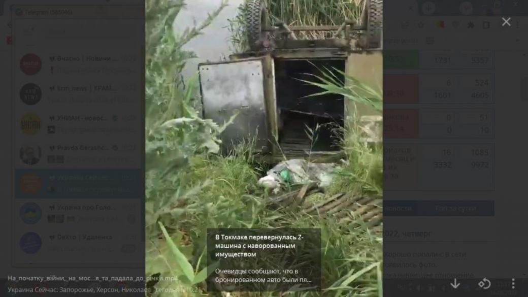 Очевидцы сообщают, что в бронированном авто были плазмы, роутеры и агромешки. Машина свалилась в реку Молочная.