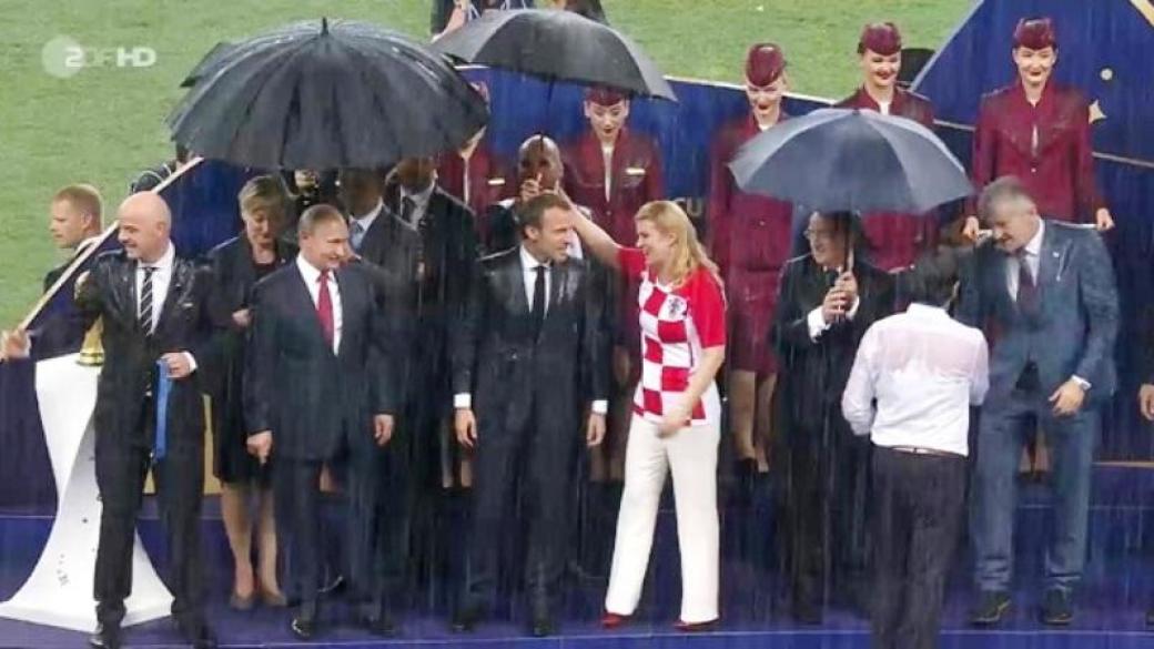 Елена Рыковцева на своей странице в соцсети разместила фото написала: «Это обалденная сцена. Это точно финал всего. Там двое живых. Француз и хорватка. И рядом с ними стоит вот эта странная мумия. Отекшая. С недвижимым лицом. Производящая руками некие неуверенные движения. И когда начинается ливень, охрана несется водружать над этой мумией зонтик. Чтобы все это видимо не растеклось под дождем. А над французом и хорваткой ни *рена. Их заливает по полной. Ну потому что живые, что им сделается».
