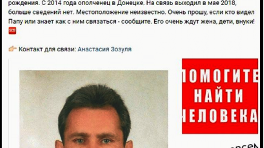 В объявлении сказано, что Леонид Иванович Зозуля 1961 года рождения воевал в рядах боевиков с 2014 года, последний раз выходил на связь с семьей в мае 2018-го.