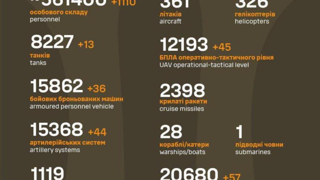 Силы обороны за прошедшие сутки уничтожили 1110 оккупантов и более 100 единиц техники