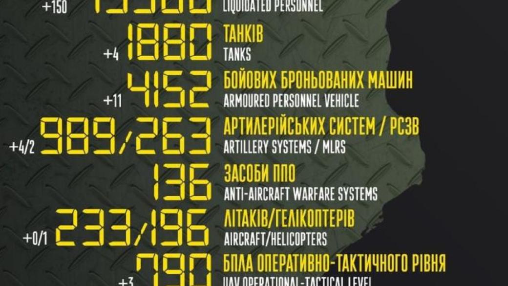 С начала полномасштабного вторжения войск РФ в Украину ВСУ уничтожили около 43 900 (+150) российских военных. Об этом сообщает Генштаб ВСУ.