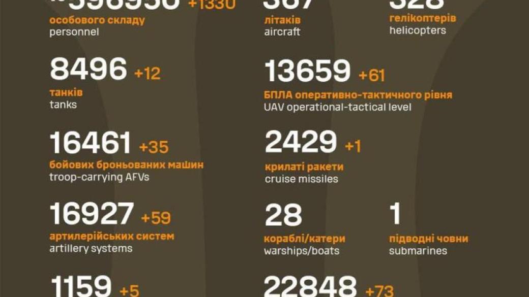 За минувшие сутки Силы обороны Украины ликвидировали 1330 оккупантов и более 250 единиц военной техники и вооружения.