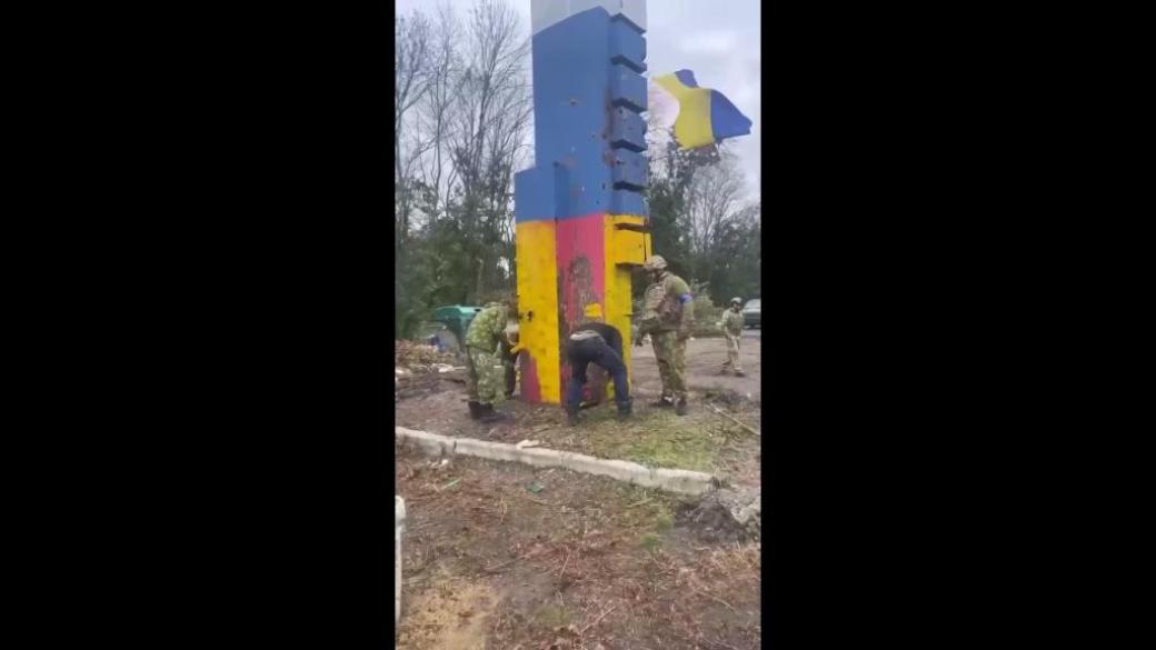 В освобожденном Купянске пленные россияне закрашивают свой триколор на стелле при въезде в город, возвращая ей первоначальный вид.