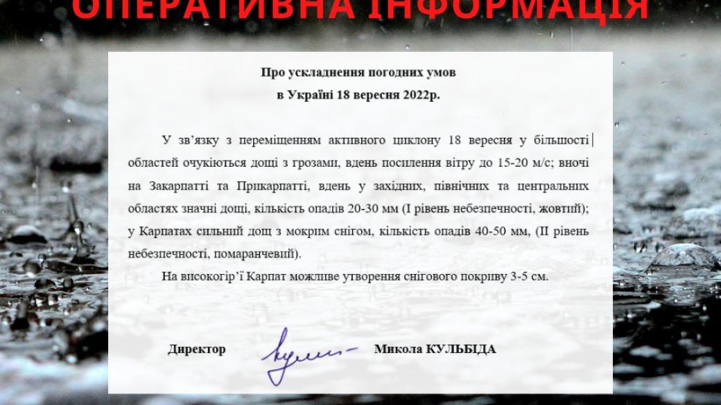 В то же время в Карпатах ожидается сильный дождь с мокрым снегом с осадками 40-50 мм. На высокогорье возможны 3-5 см снега. В горах объявлен ІІ уровень опасности (оранжевый).