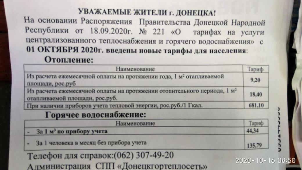 По его словам, при наличии приборов для учета тепловой энергии тариф для населения достигнет 681,10 руб/Гкал (247,8 грн/Гкал). Отмечается, что в неподконтрольном Украине Донецке оплата вырастет на 28%, в Горловке — на 17,8%, в Макеевке — на 5,1%, а в поселке Новый Свет — на 72%.
