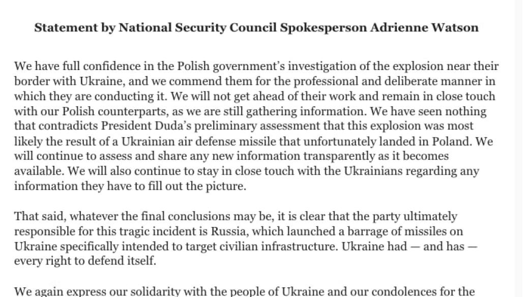 — США доверяют польскому расследованию взрыва, установившему, что инцидент, скорее всего, был вызван украинской ракетой ПВО;