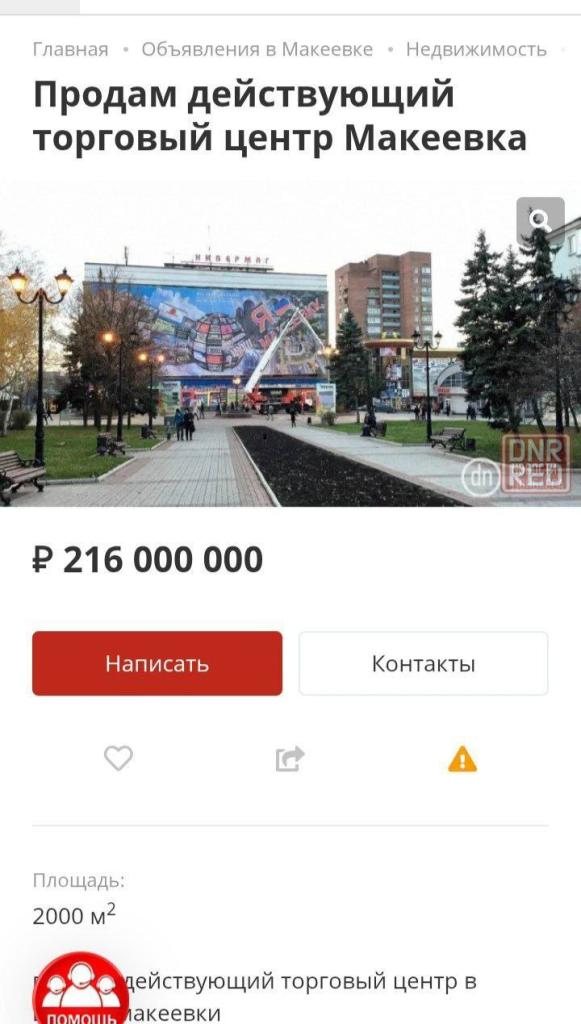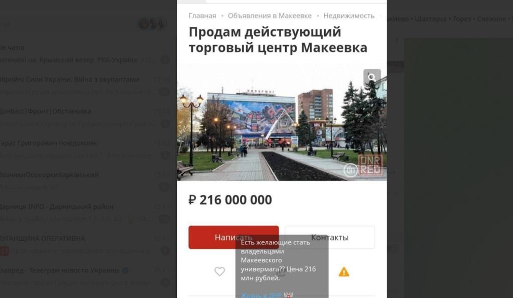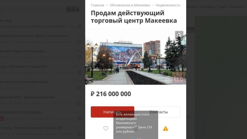В оккупированной россиянами Макеевке Донецкой области выставили на продажу универмаг, расположенный в центре города за 216 млн рублей. Судя по объявлению, торговое помещение продается еще с августа текущего года. Владелец универмага отмечает, что "состояние здания отличное".