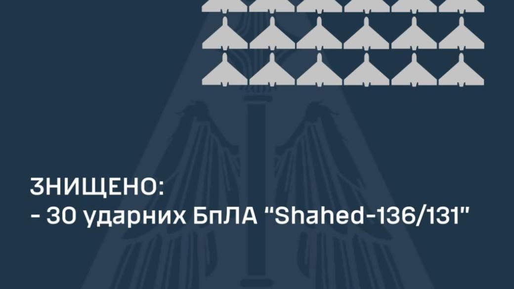 В результате боевой работы уничтожено 30 "шахедов" в пределах Днепропетровской, Киевской, Винницкой, Черниговской, Сумской, Полтавской, Черкасской, Херсонской, Запорожской, Николаевской и Хмельницкой областей.