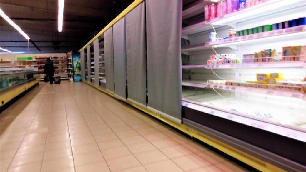 На просторной стоянке супермаркета находятся всего несколько машин, внутри магазина — полупустые полки и полное отсутствие покупателей. Из товара — алкоголь, конфеты и немного чего-то еще.