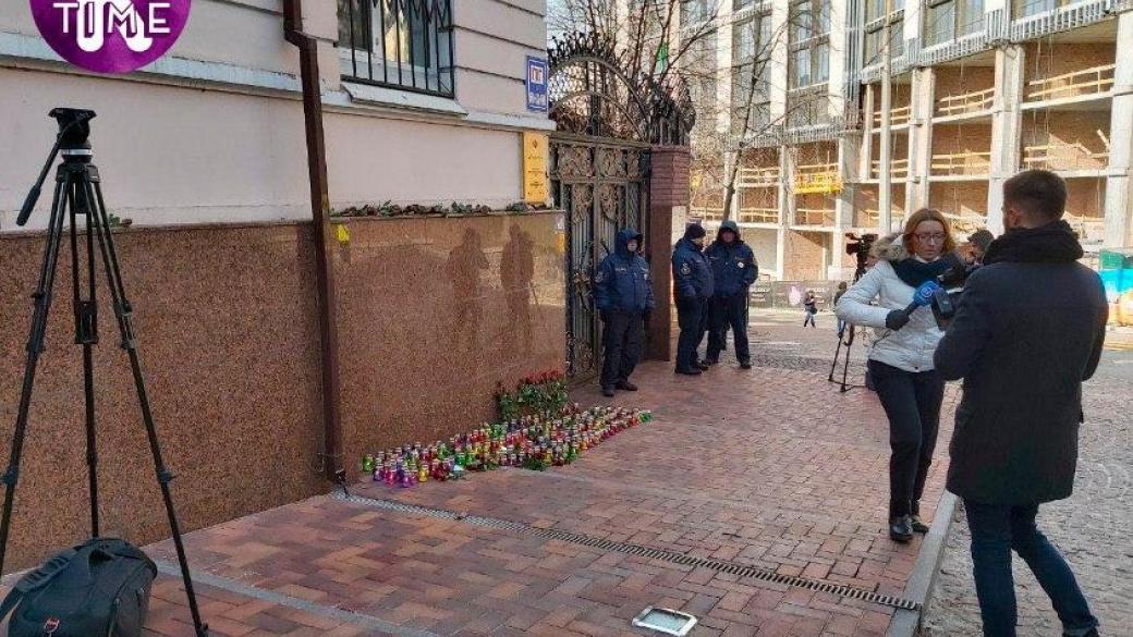 Почтить память погибщих под посольстао Ирана в Киеве пришли около сотни человек, которые принесли лампадки и цветы.