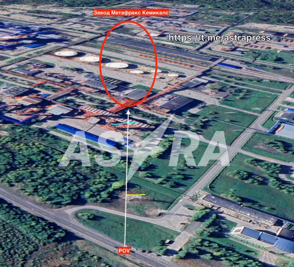 БПЛА нанесли удар по химическому предприятию «Метафракс Кемикалс» в Губахе Пермского края, установила ASTRA с помощью OSINT-анализа фото очевидца, опубликованного украинским ТГ-каналом Exilinova+. Кадр сделан в примерно в 400-600 метрах от завода «Метафракс Кемикалс». завод находится примерно в 1600 км от Украины.