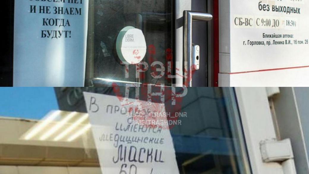 Подконтрольный ОРДО Телеграмм-канал опубликовал фото аптек «ДНР», на которых висят объявления о том, что масок и необходимых медицинских изделий в продаже нет или продаются по высокой цене.