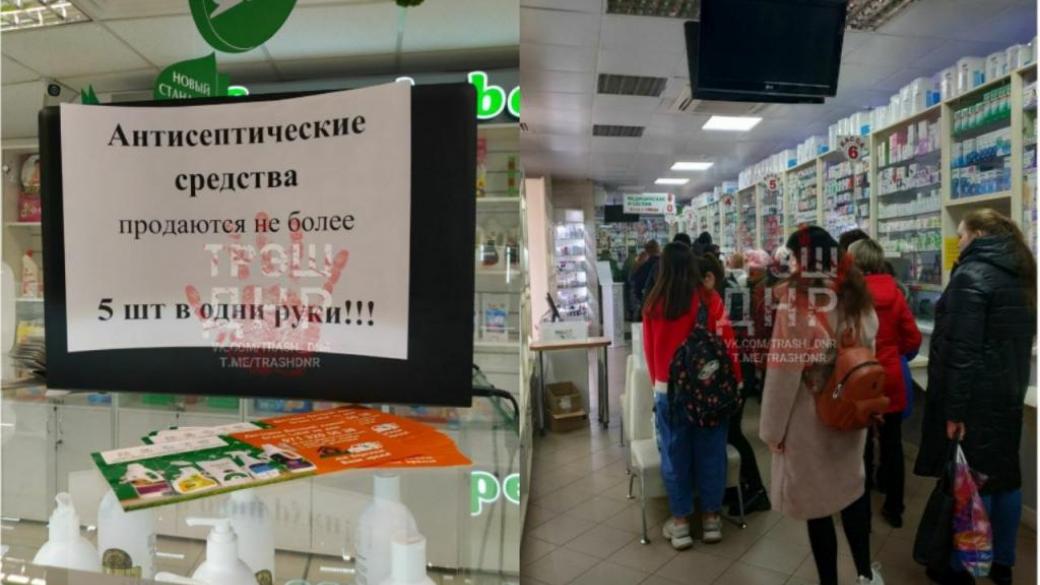 «Очевидцы присылают фото из аптек „республики“, где десятки людей толпятся в очередях за масками и антисептиками, которых нет в продаже или они отпускаются до 5 штук в руки. Прямо как крупы в продовольственных магазинах — до 5 кг. Правители, вы вообще осознаете, что такое „нет медицинских масок“? Это как коробка спичек. Они обязаны быть в избытке всегда».