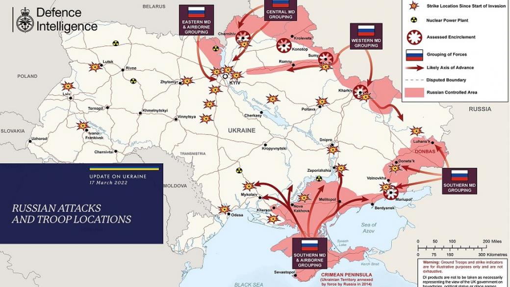 По состоянию на 17 марта ситуация на фронте в разных областях Украины остается без особых изменений. Об этом свидетельствует актуальная карта российского вторжения в Украину, которую опубликовала в Twitter британская разведка.