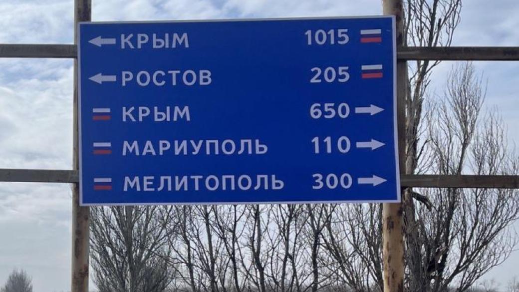 В оккупированном с 2014 года Донецке появились топорно сделанные дорожные знаки, указывающие дорогу на захваченные Крым, Мелитополь, Мариуполь.