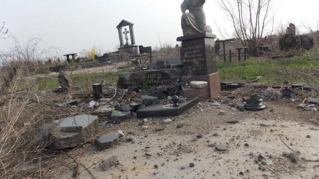 По данным боевиков, сегодня утром в Свято-Иверском женском монастыре состоялась церковная служба с поминовением усопших. На фото видно, что многие могилы пострадали в результате боевых действий, а часть их практически полностью разрушена.