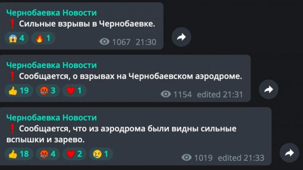 В Чернобаевке слышны взрывы. Об этом сообщают местные СМИ.