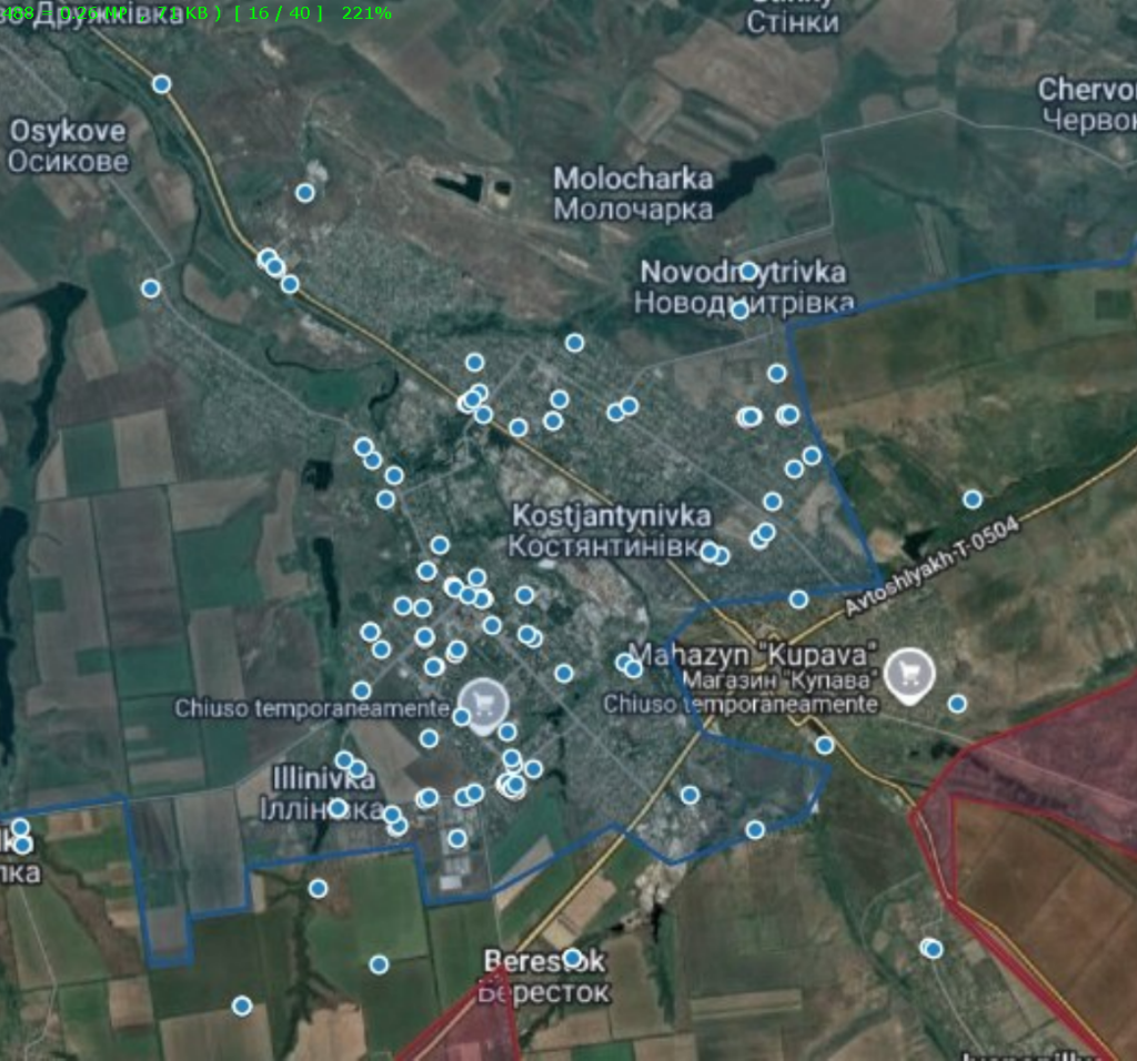 В течение 30 дней Константиновка находится под интенсивным обстрелом. OSINT-аналитик Playfra представил карту ударов: каждая синяя точка — это отдельный «прилет». Об этом сообщают «Новости Донбасса».