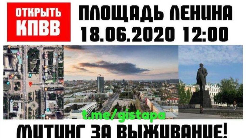 18 июня в 12:00 в неподконтрольном Украине Донецке жители ОРДО намерены провести «Митинг за выживание» в ходе которого хотят потребовать от «власти ДНР» открыть КПВВ, чтобы выехать на подконтрольную Украине территории. Об этом местные жители сообщают в соцсети и публикуют анонс акции протеста.