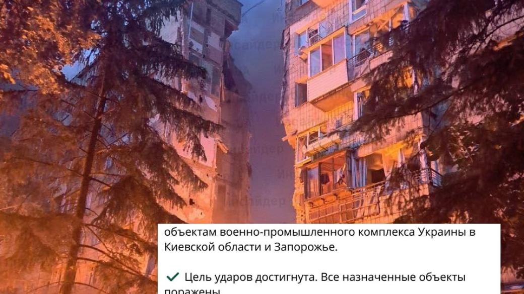 «Сегодня ночью ВС рф нанесен групповой удар высокоточным оружием воздушного, наземного и морского базирования, а также ударными БПЛА по объектам военно-промышленного комплекса Украины в Киевской области и Запорожье. Цель ударов достигнута. Все назначенные объекты поражены», - так отчиталось минобороны рф о массированном обстреле гражданских объектов в Украине.