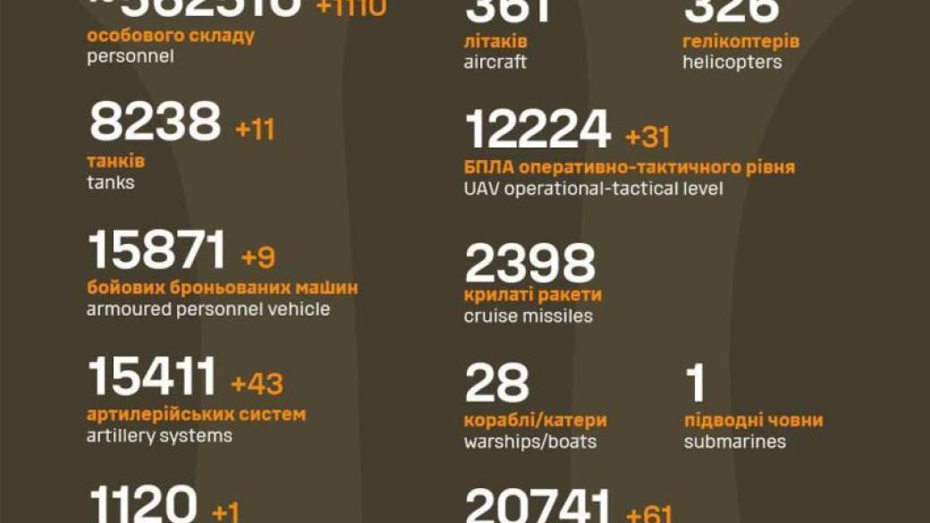 За прошедшие сутки ВСУ ликвидировали 1 110 оккупантов, 43 артсистемы, 1 ПВО и множество вражеской техники.