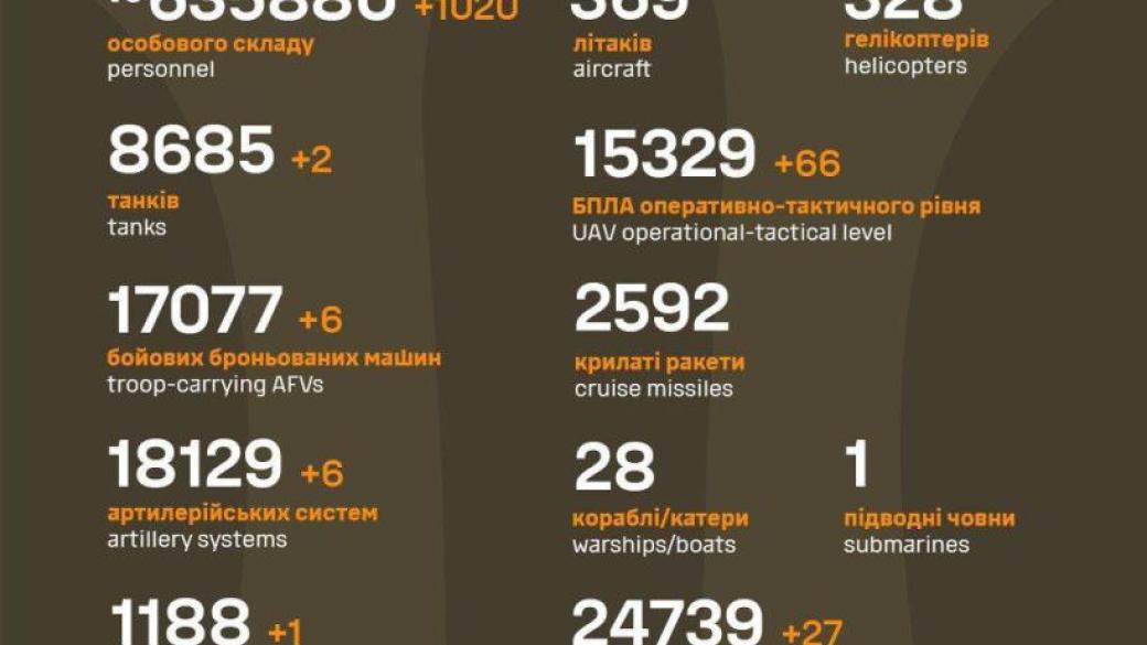 ВСУ за последние сутки уничтожили 1020 оккупантов и более 100 единиц вражеской техники.