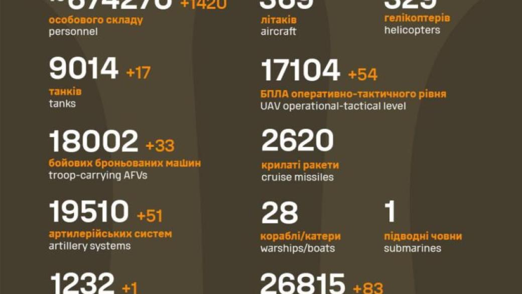 Украинские защитники за прошедшие сутки ликвидировали 1420 российских захватчиков и уничтожили более 240 единиц вражеской техники.