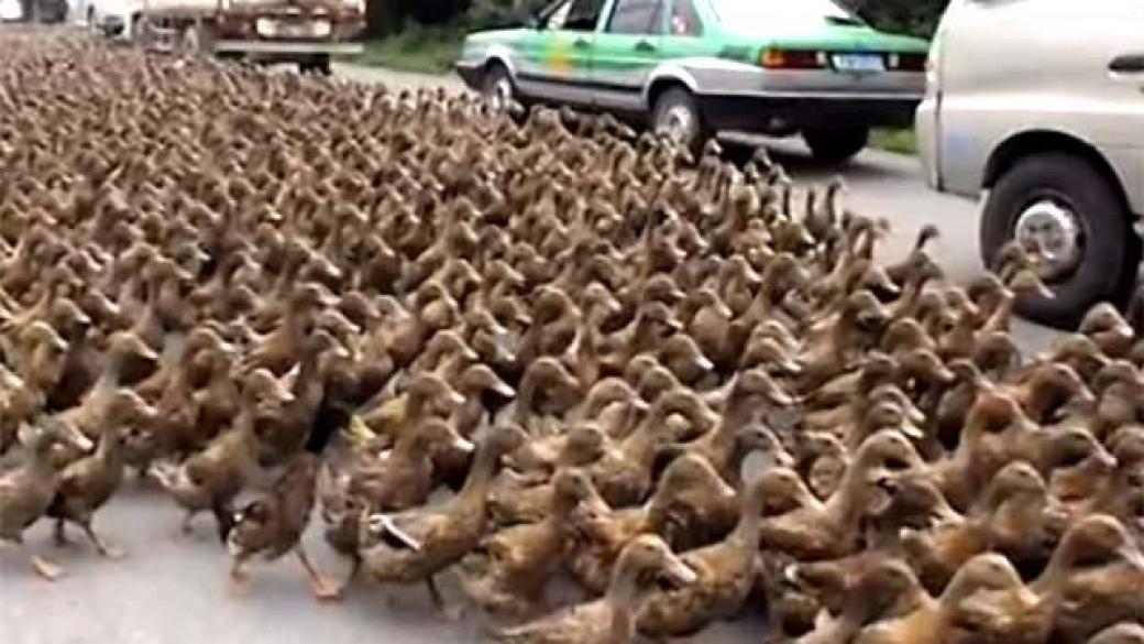В Китае очевидцев ошеломил огромный поток уток, которым вздумалось целой «оравой» пересечь проезжую часть трассы. Соответствующая видеозапись опубликована в YouTube.