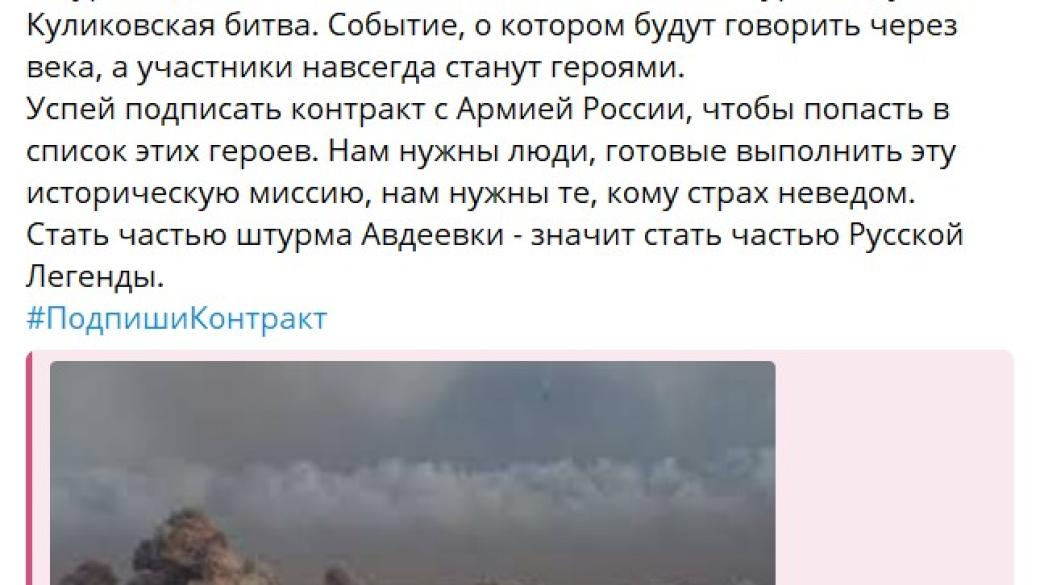"Штурм Авдеевки - это знаковое событие, наша Курская дуга и Куликовская битва. Событие, о котором будут говорить через века, а участники навсегда станут героями. Успей подписать контракт с армией России, чтобы попасть в список этих героев. Нам нужны люди, готовые выполнить эту историческую миссию, нам нужны те, кому страх неизвестен. Стать частью штурма Авдеевки - значит стать частью российской легенды".