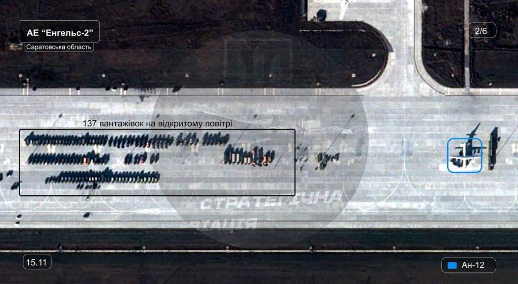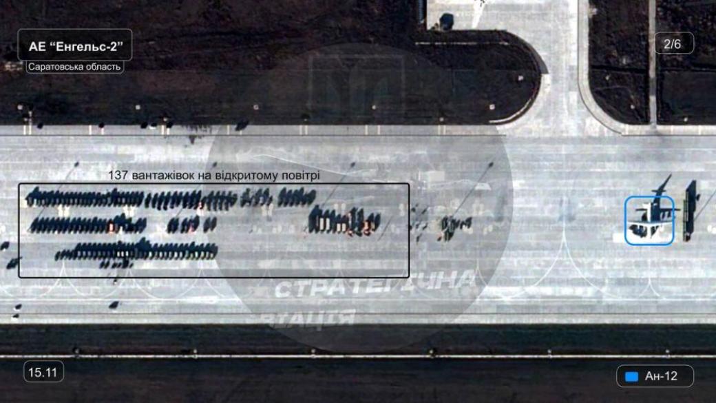 Паблик публикует спутниковые снимки, на которых видны 137 грузовиков, стоящие на стоянке самолетов, рядом с транспортным Ан-12. На данный момент неизвестна цель их пребывания, ресурс предполагает, что это может быть перевозка вооружения для базирующихся на авиабазе бомбардировщиков.