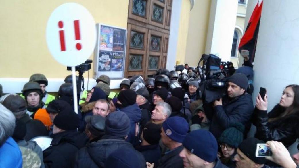 В то же время, участникам акции удается постепенно продвигаться вперед — внутрь здания. В мегафон активисты кричат, что «Порошенко — провокатор» и призывают людей пропустить внутрь.
